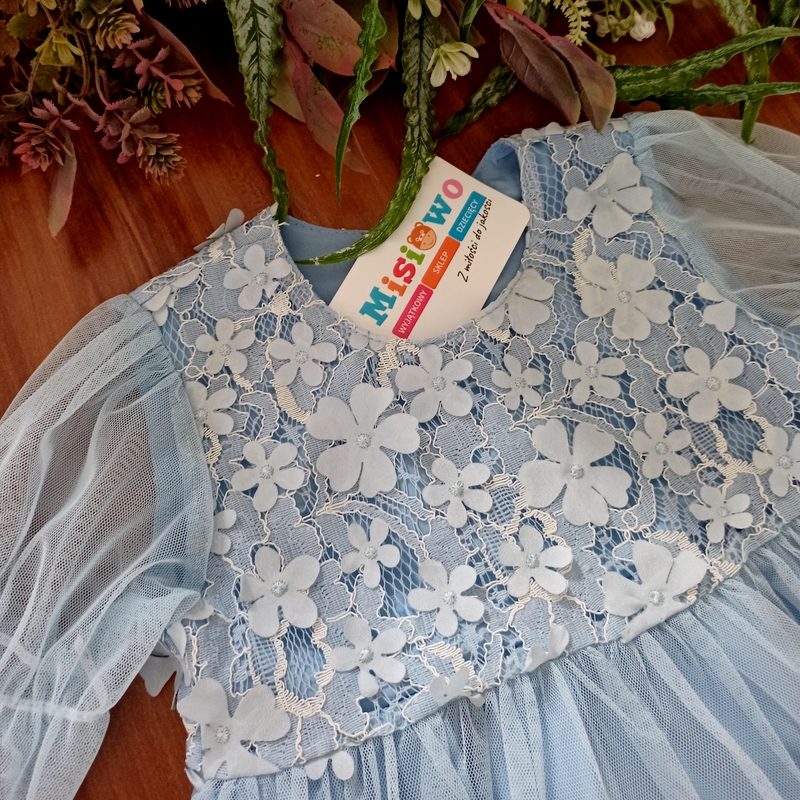 Uroku sukience dodają tiulowe rękawki typu buffki, wykończone gumeczką i falbanką.