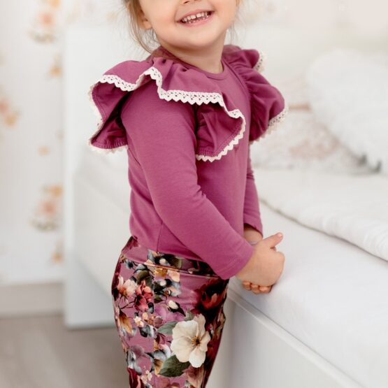 W zestawie znajdziecie gładkie body ozdobione szerokimi falbanami