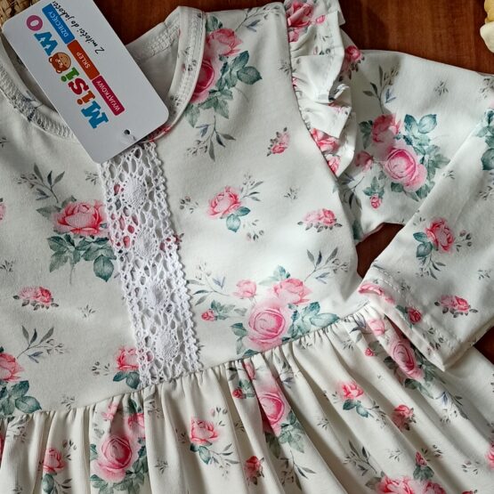 Sukienka dzianinowa z falbankami i koronkowym obszyciem RÓŻA ECRU