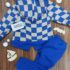 szachownica w odcieniach zgaszonego beżu i chabrowego błękitu.