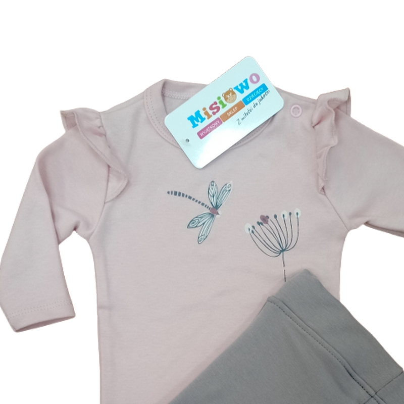Wąskie, gładkie spodnie- legginsy w odcieniu zgaszonego fioletu tworzą z body piękny, pastelowy komplet.